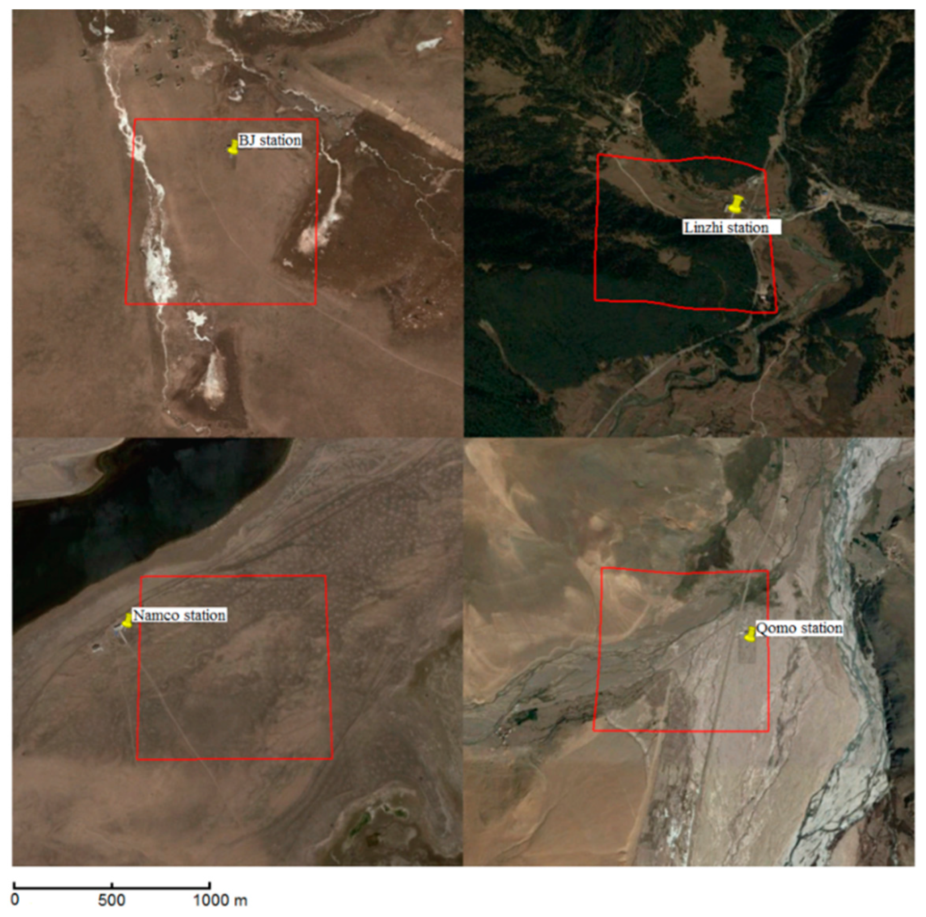 The four ground stations location on the Tibetan Plateau (yellow pin) and the footprint of the pixel used for the validation (red lines). BJ (31°22’N, 91°53’E), Linzhi (29°45’N, 94°44’E), NamCo (30°46’N, 90°59’E), Qomo (28°21’N, 86°56’E).