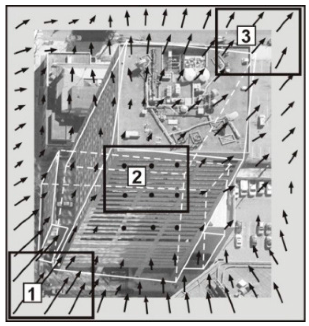 Traditional 2D-3D registration methods solve for the camera’s position (XS, YS, ZS)T and its orientation matrix R in Equations (1) and (2). However, none of the distortion models are perfect. Any distortion model cannot completely describe the distortion over the entire image plane, i.e., the residual errors (incomplete correction) still remain no matter what kind of distortion model is adopted. As a result, the accuracy of image coordinates in the entire image plane is asymmetric (see Figure 1). This phenomenon has been demonstrated in [7] and it becomes obvious for a big dimension of aerial images, especially in which a much higher and bigger building is imaged on a large area in the image plane [8]. Two constraint conditions are added into the traditional transformation model (Equation (1)) to increase the accuracy, reliability and robustness of the image distortion correction. For the example shown in Figure 1, the image distortion in Region 1 is different from that of Regions 2 and 3. If a conventional transformation model (e.g., photogrammetry backward intersection (PBI)) is applied to register such a 2D image that contains various and dissymmetric distortions with a 3D object represented by a rigid model, errors in the 2D-3D registration are undoubtedly unavoidable. This problem is especially profound for high-rise buildings because the bottom and top of a high-rise building are affected by different distortions in the same image. To avoid this problem, this paper presents a novel algorithm using two types of geometric constraints, i.e., co-planar and perpendicular conditions, to improve the accuracy of the 2D-3D registration. The two conditions added in the proposed transformation model, in relation to the original rigorous transformation model, can be summarized in the following.