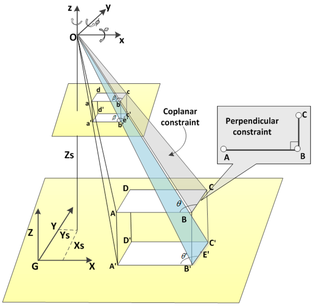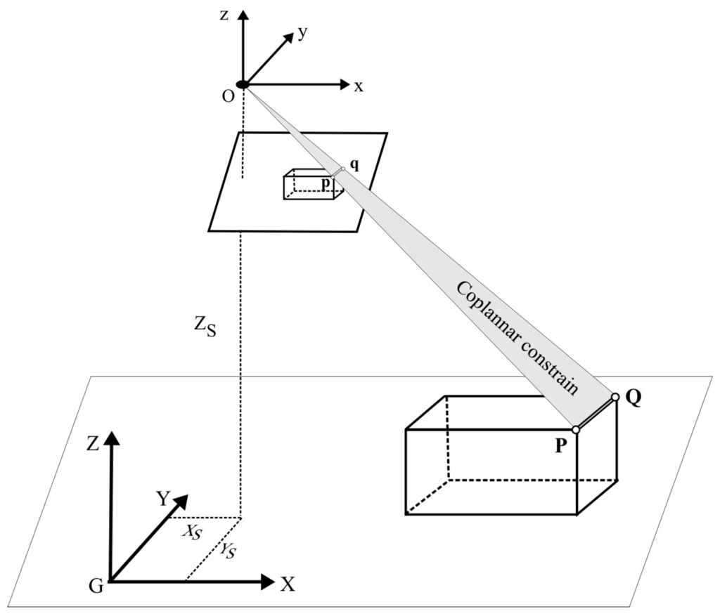 Considering the advantages and disadvantages of the two foregoing methods (i.e., [33,34]), this paper presents two types of constraint conditions, i.e., coplanar and perpendicular conditions. This idea comes from the fact that Zhou et al. [8] demonstrated that two aerial images over an urban area will have different accuracy of registration even with the same digital building model (DBM) and the same algorithm. This implies that highly accurate 2D-3D registration will not be achievable if constraint conditions are not applied.
