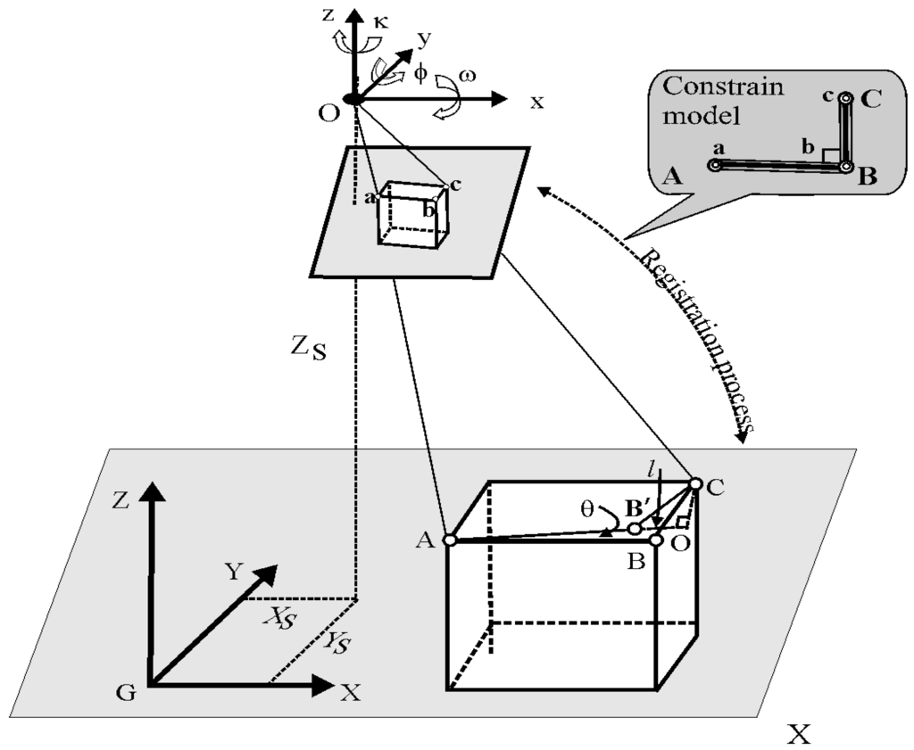The perpendicularity constraint in 3D space is added to ensure preservation of the registered 2D and 3D pairs after applying registration transformation. As shown in Figure 3, suppose that AB and BC are two edges of a flat house roof, and their corresponding edges in the 2D image plane are ab and bc. Suppose that the coordinates of A, B and C are (XA, YA, ZA), (XB, YB, ZB) and (XC, YC, ZC), respectively, in the object coordinate system. For a flat-roof, cube house, the heights (i.e., Z coordinates) of A, B and C are the same, and the line segments AB and BC are perpendicular to each other. If AB is not perpendicular to BC and the angle between them is θ, i.e., B deviates from its correct position at B′, a line from C to O is drawn, and CO is perpendicular to AB′. l is the distance between B and O and can be expressed by [8]: