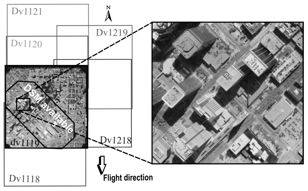 The experimental field is located in downtown Denver, Colorado, where the highest buildings reach 125 m, and many buildings are approximately 100 m. The City and County of Denver, Colorado, provided us with the aerial images and digital surface model (DSM).