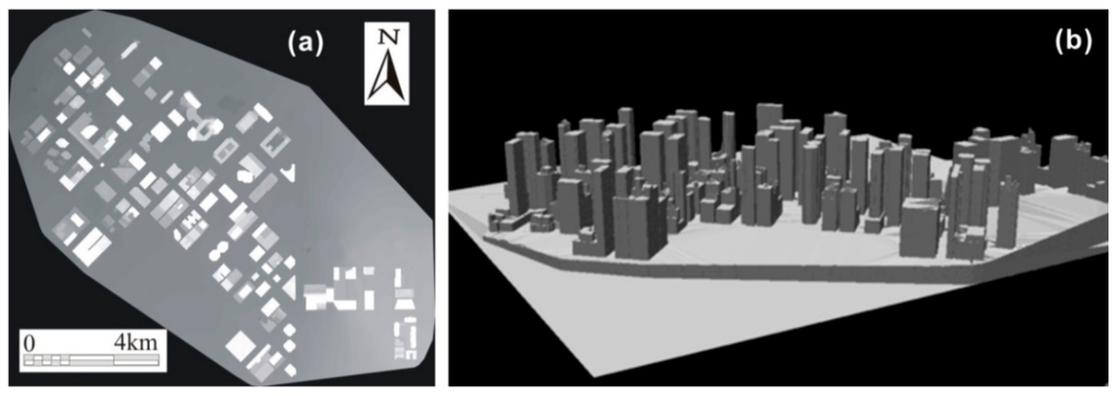 Figure 6. (a) 2D brightness is applied to represent the digital building model (DBM); and (b) constructive solid geometry (CSG) is used to represent the DBM [6].