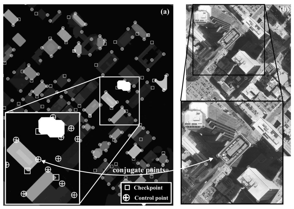 In a word, the coplanarity constraint condition in Figure 2 improves the accuracy of co-registration along a line (i.e., building edge), and the perpendicular constraint condition in Figure 3 improves the accuracy of co-registration along perpendicular lines (i.e., two perpendicular building edge). The two types of constraint conditions can maximize the accuracy symmetry without the need of adding additional GCPs.