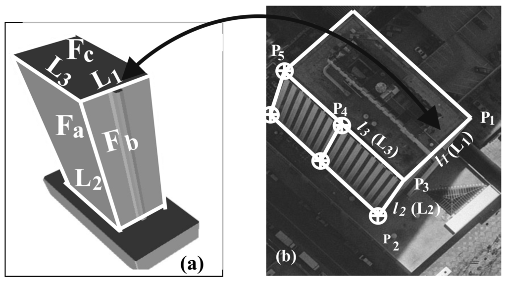 With the measured “GCPs” in Section 4.1, the 2D-3D registration model in Equation (18) can be established. Meanwhile, the two types of geometric constraint conditions, co-planarity (Equation (12)) and perpendicularity (Equation (16)), can simultaneously be established using the measured “GCPs”. For example, the faces, Fa, Fb and Fc, the edges, L1, L2 and L3, and their attributes are described in the CSG model (see Figure 8a,b). From the attributes of the face data structure, L1 and L3 are automatically recognized as the edges of roofs, and L2 is seen as the edge of a wall. However, the control points P1, P3 and P5 are extracted, and they can be automatically constructed lines, l1, l2 and l3. When L1, L2 and L3 are back-projected onto the original aerial image, L1, L2 and L3 will be matched with lines l1, l2 and l3, respectively (Figure 8b). Thus, the attributes (e.g., edges of roofs and edges of walls) and topographic relationships (i.e., perpendicularity) of l1, l2 and l3 can be inherited from L1, L2 and L3. Thus, l1 and l3 are edges in the roof, and l2 is a vertical line in the wall. Additionally, l2 is perpendicular to l1 and l3; l1 is also perpendicular to l3. Therefore, when l1 ⊥ l3, Equation (16) is applied to construct a perpendicular constraint condition by replacing A, B and C by P5, P3 and P1 (see Figure 2). Similarly, the coplanar constraint condition (Equation (12)) can be established, as well. By combining all established equations above, the registration equations for Equation (18) are established.