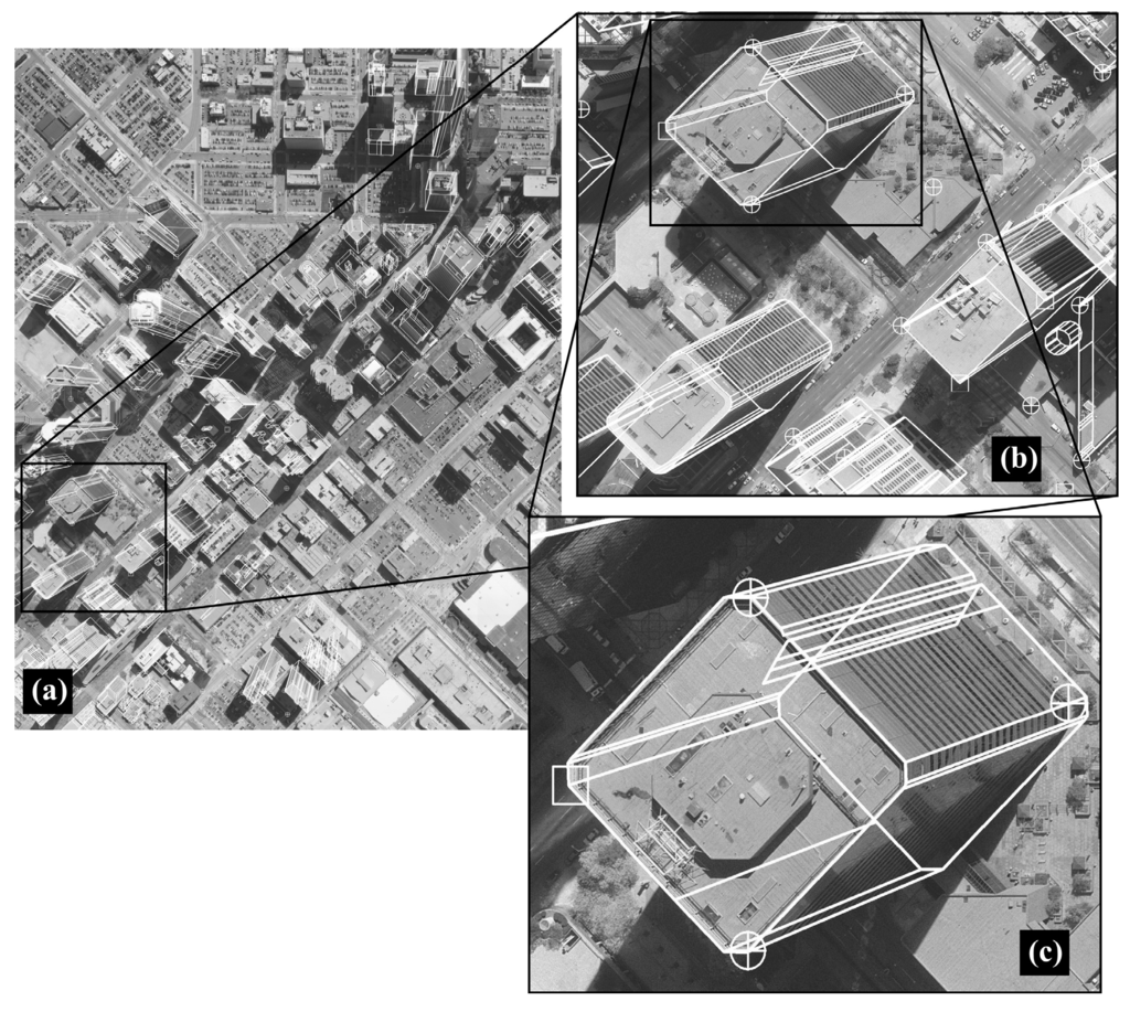 The experimental results of 2D-3D registration using the proposed method. (a) The 2D-3D registration results with the proposed method; (b) the sub-area of (a) framed by the black rectangle; (c) the sub-area of (b), which illustrates the detail 2D-3D registration results of a single high-rise building.