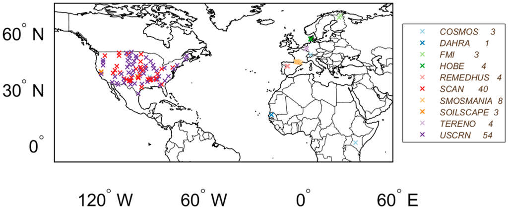 To independently evaluate the improvements in the combined product compared to the individual parent product, in situ measurements from the International Soil Moisture Network (ISMN, [36]) were used. The AMSR2 scan time was also applied to select daily observations that are closest to the AMSR2 observations.