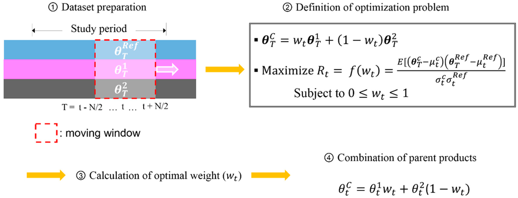 where each presents the standard deviation of each product, and R is the temporal correlation coefficient between two products. It should be noted that Equation (3) is only applicable for two parent products that show positive temporal correlations against a reference, and the optimal weight is obtainable for general cases (i.e., a pair of one or more products with negative and/or positive correlations against a reference) by solving the optimization problem described by Equation (2).