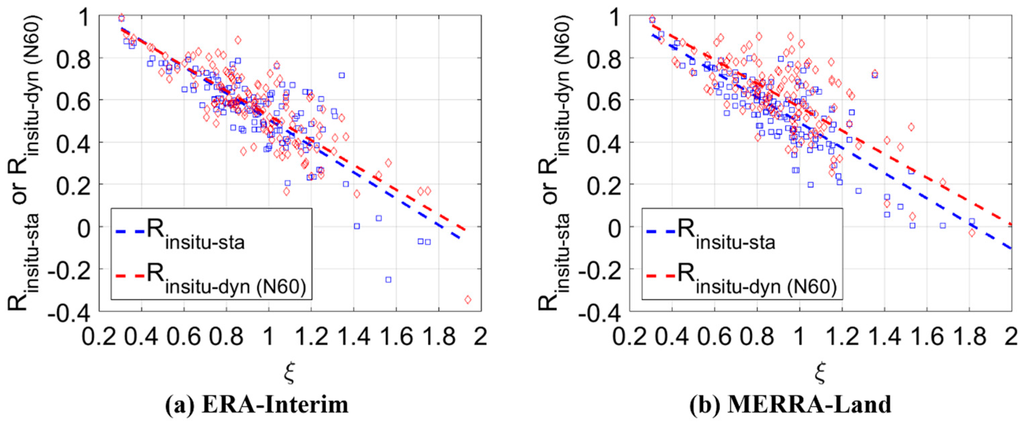 Combination performances with the quality of parent products and reference against in situ measurements. (a) ERA-Interim; (b) MERRA-Land. The x-axis for each panel presents the Euclidean distances (ξ) calculated by Equation (8), and the y-axis or . Linear regression lines represent the tendencies of both cases.
