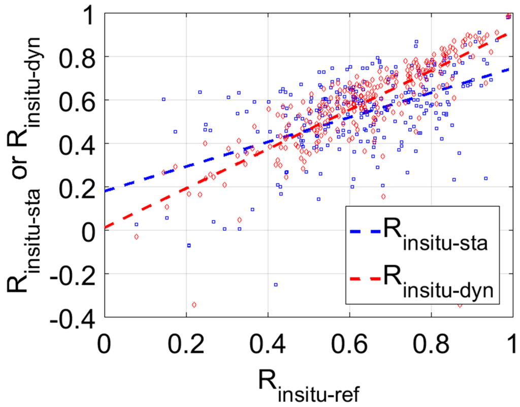 At every station, R was determined through the static and dynamic approaches against corresponding in situ measurements ( and ) and was plotted against the Euclidean distances (Figure 8).