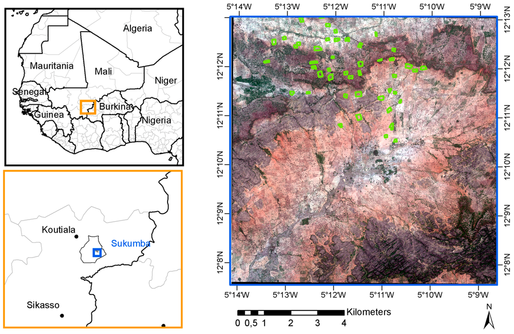 Sukumba site, near Koutiala in southeastern Mali. The 10 km × 10 km blue box locates the VHR imagery acquisition. The in-situ bi-weekly monitored fields represented by green boundaries are spread along a catena transect from plateau (north) to lowland (south). Background imagery is a GeoEye RGB color composite from 24 June 2014.