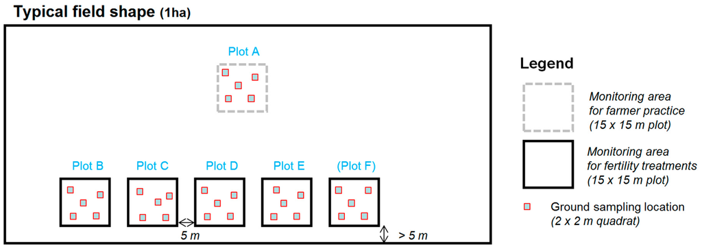 Cropping systems in the Koutiala district are based on cotton, maize, sorghum, and millet rotations. The five main crop types that were covered by the field campaign also included peanuts. Under rainfed conditions, the growing season ranges from late May to November. A set of 48 farmer fields was selected to monitor plant growth and development during the 2014 growing season. To cover the wide range of within-season variation that may be encountered in these heterogeneous environments, suitable fields (farming management units) were identified through a participatory selection process along the catena to adequately sample gradients in soil physical and chemical properties. Within each farmer field monitored, fertility treatment plots were included to ensure a full range of variability that may be present in the local landscape. A standardized protocol [19] with recommended fertilizer type and quantity for each crop type was used (Table 2). Urea was applied at earing, and other fertilizers at sowing. The fertility experiment layout is schematized in Figure 2. Within each field, five (cotton, maize, and peanut) or six (millet and sorghum) plots of 15 m × 15 m were picketed (Figure 2: solid outline boxes). One plot, and the remainder of each field was managed as per farmer practice (Figure 2: dashed outline box). Plant growth, development, biomass and grain yields were measured in all plots. Each participating farm could contribute only one field. Small field sizes did not allow for replicates within a single field, but instead treatments were replicated (10 cotton, 10 maize, 10 millet, 9 peanut and 9 sorghum fields) across the landscape.