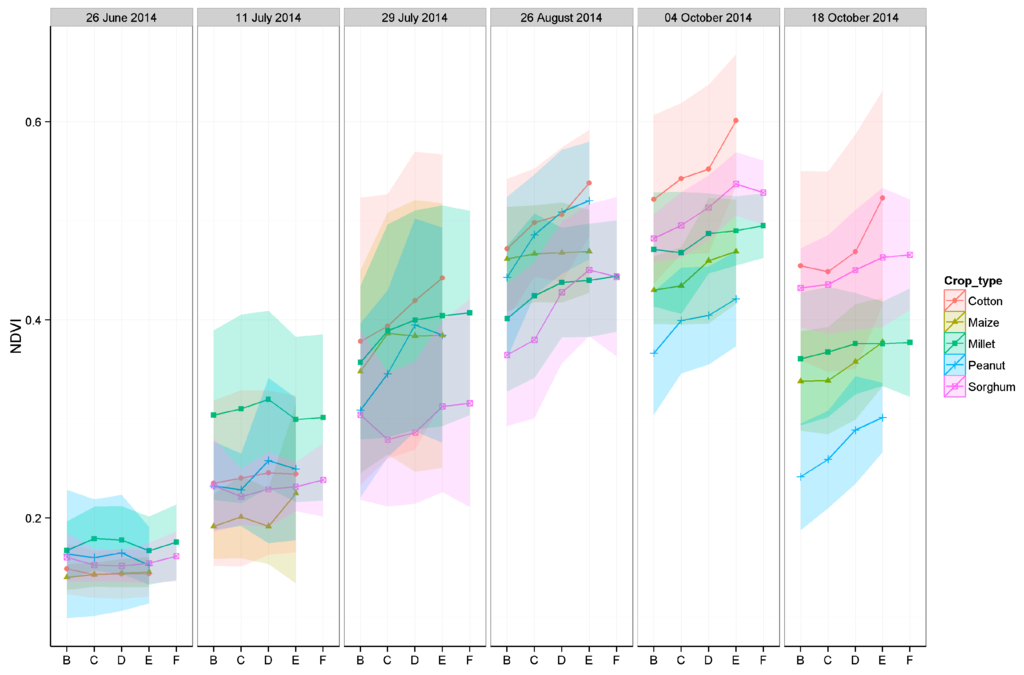 We first graphically assess the overall impact of fertilization by extracting the NDVI response from plots observed in the VHR satellite images. The mean and standard deviation were computed per crop type for each fertilizer application (plot B to F) and from emergence to senescence. We discuss the fertilization effect with regard to landscape-scale variability.