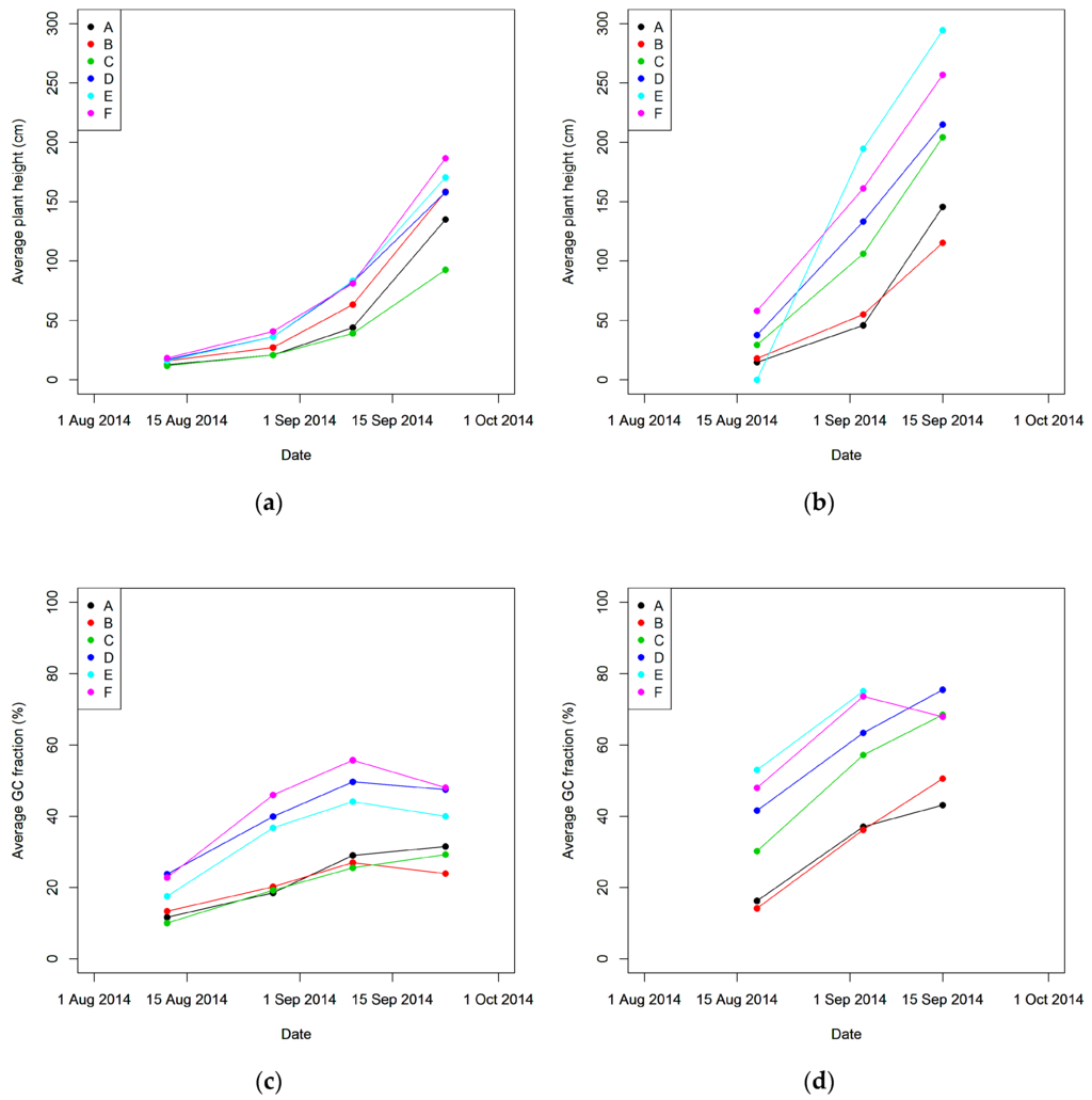 Evolution of crop height (a,b) and ground coverage (GC) fraction (c,d) for fertilizer application treatments A–F for the Millet (a–c) and Sorghum (b–d) fields also shown in Figure 4.