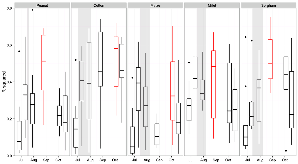 Figure 3 shows the impact of fertilizer application treatments on NDVI for the five crops using six VHR images well distributed throughout the crop growing cycles and acquired after sowing. Millet NDVI is fastest to rise reflecting the vigorous establishment of the species. By late August differences between crops tend to reduce reflecting general canopy closure. Sorghum is the latest crop to establish with a delayed NDVI response. Sorghum showed a stronger NDVI increase with fertilizer applications than the other crops, clearly visible in late August. Millet displays an overall weak or no NDVI response to fertilizer application, as expected. Maize NDVI response to fertilizer is surprisingly weak throughout, indicated that ground cover was not strongly affected by the additional fertilizer applications. The highest apparent response to fertilizer application in early October is misleading and reflects differences in maize senescence. A fertilization effect is also observed for both cotton and peanut with the largest mean differences between plots on 4 October 2014 for cotton and 28 August 2014 for peanut.