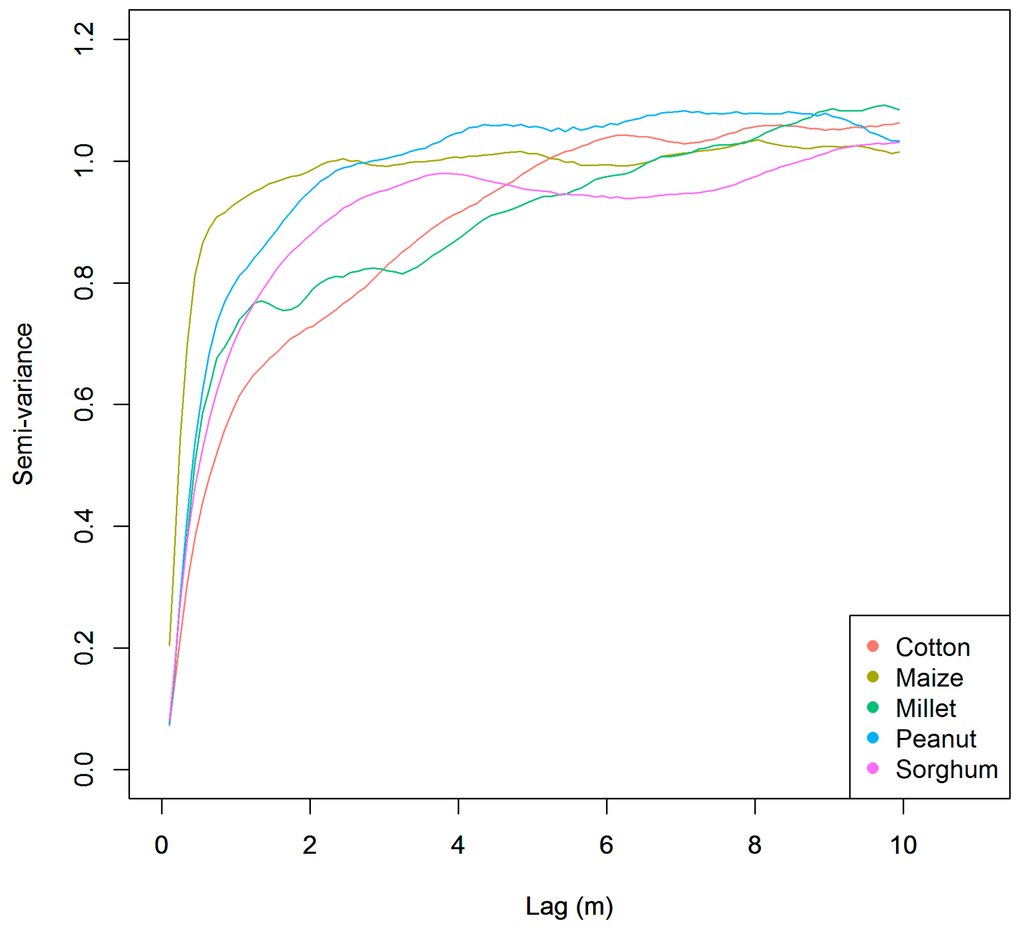 The model used to quantify the effect of the fertilization on the NDVI relies on the assumption of independence of the observed areas (i.e., the DG pixels). Figure 7 shows semi-variograms based on the 10 September 2014 image when fields are at their maximum ground cover and thus feature lowest spatial autocorrelation during the growing season. Pixel values are only strongly correlated on short distances as indicated by the low nugget values and steep rise of semi-variance. Image values are more or less uncorrelated beyond 2 m for peanut, maize and sorghum fields. The influence of spatial correlation is present at larger distances for cotton and millet, but 75% of the variance is still captured within 2 m. Without accounting for the point spread function of the various instruments, the satellite multispectral pixels can be considered as mostly independent as they sample the ground at a 2 m resolution.