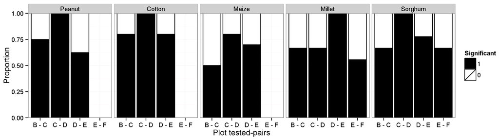 The overall NDVI response to fertilizer application does not mean that all differences in application amounts can be quantified accurately. It only shows that at least one of the treatments affected the NDVI response. The plant response to fertilizer application is non-linear, but the NDVI difference between treatment pairs was significant in most cases (for at least 70% of the fields, as seen in Figure 8) for the most discriminating images as indicated by the red boxplots in Figure 6. More specifically, treatments in C and D plots were discriminated in all for peanut, cotton and sorghum fields. The maize crop again shows a larger similarity in NDVI response between the treatments, leading to a lower proportion of plots with a significant difference. In contrast to the other crops, in millet fields, the NDVI discriminated plots D and E (i.e., doubling the DAP dose) best. For this crop, a higher fertilizer dose was required for a significant response of the canopy reflectance. However, in poor soil fertility environment, the largest difference in NDVI was expected for plots B and C, but the strongest response in Millet was surprisingly observed for plots D–E, while other crops C–D for other crops). This likely indicates a very strong response variability within fields.