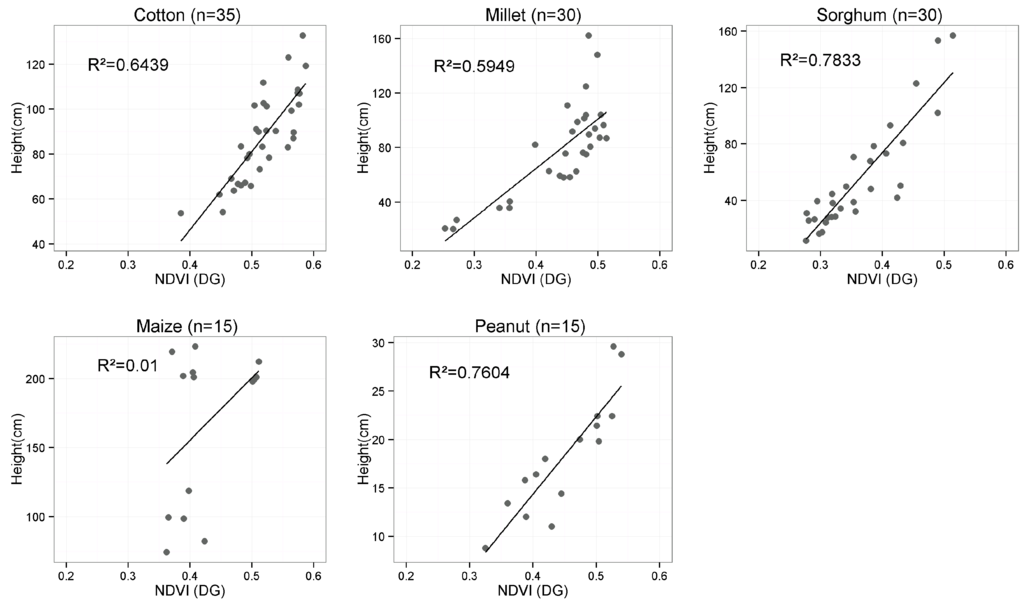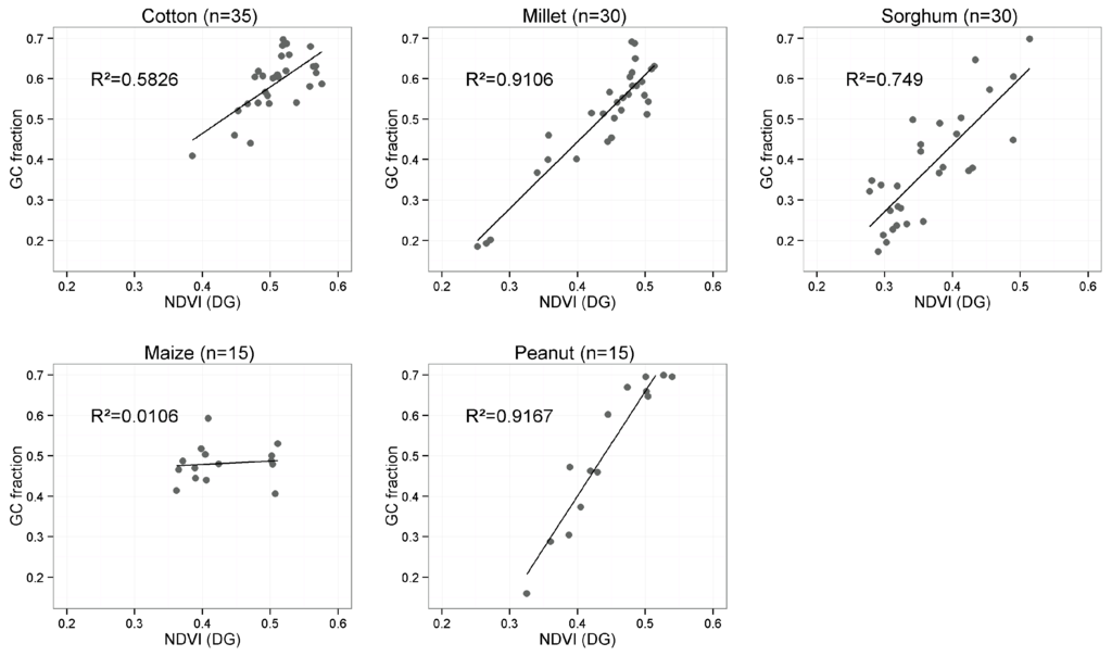 Fertilization affects NDVI (as seen in Section 4.1) because plant growth strongly responds to fertilizer under nutrient limiting conditions. Figure 9 and Figure 10 show the relationships between NDVI and GC fraction or plant height, respectively. At the plot scale, NDVI was moderately to strongly correlated to GC fraction and plant height for cotton, millet, sorghum and peanut. A strong linear relationship was expected for peanuts between NDVI and GC fraction because of its plant canopy structure. Peanut growth leads to a small plant height increase but a strong ground coverage increase that directly impacts NDVI by masking the background soil surface. For maize, plant height did not respond strongly to fertilization. The range in GC fraction was very small for maize fields on 26 August 2014. In general, GC fraction is fairly low, even at more advanced growing stages due to large distances between rows and relatively low nutrient application levels.