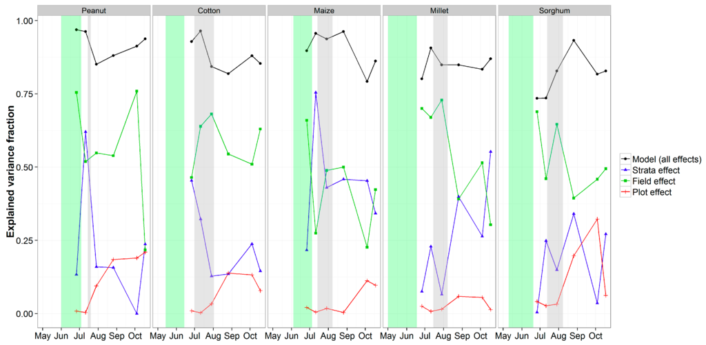 The fraction of variance explained by fertilization treatment was generally small when compared to the variation due to field and stratum, ranging from 1% to 35% of the total variance observed. Its contribution to the explanatory power of the model was largest in early October for maize and sorghum fields and around the end of August for cotton and peanut fields (the high values observed for peanut in October were misleading as they correspond to fields already harvested). Sorghum responded strongly to fertilizer in its vegetative growth. As previously observed, Millet shows a weak response to fertilization treatment. This is partly related to more millet cultivation in the most constraining areas, reducing the fertilization effect in plots and increasing the contribution of the field effect. In addition, the fraction of variance explained by fertilization treatments would have been higher if farmers would not have fertilized some cotton and maize fields before the protocol had been put in place. Although total fertilizer application levels were adjusted proportionally to correct for that pre-existing situation, the effects of application on the control plots could not be corrected for.