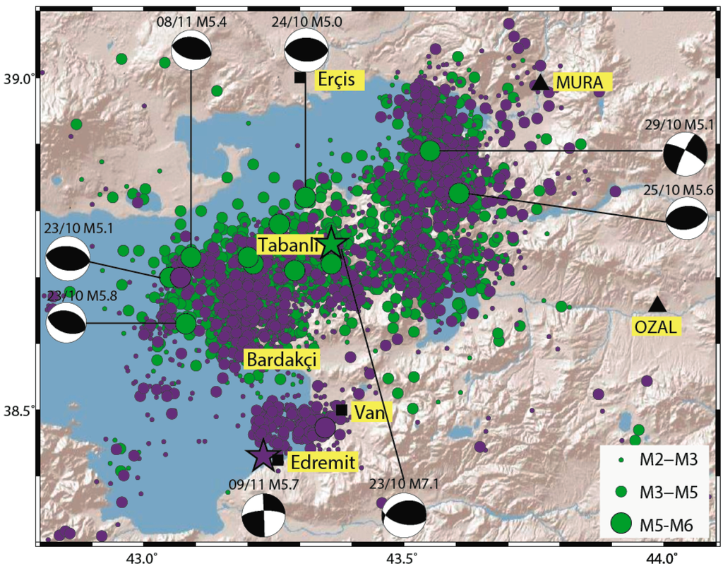 - Irmak, T.S.; Doğan, B.; Karakaş, A. Source mechanism of the 23 October, 2011, Van (Turkey) earthquake (m-w = 7.1) and aftershocks with its tectonic implications. Earth Planets Space 2012, 64, 991–1003. [Google Scholar] [CrossRef]