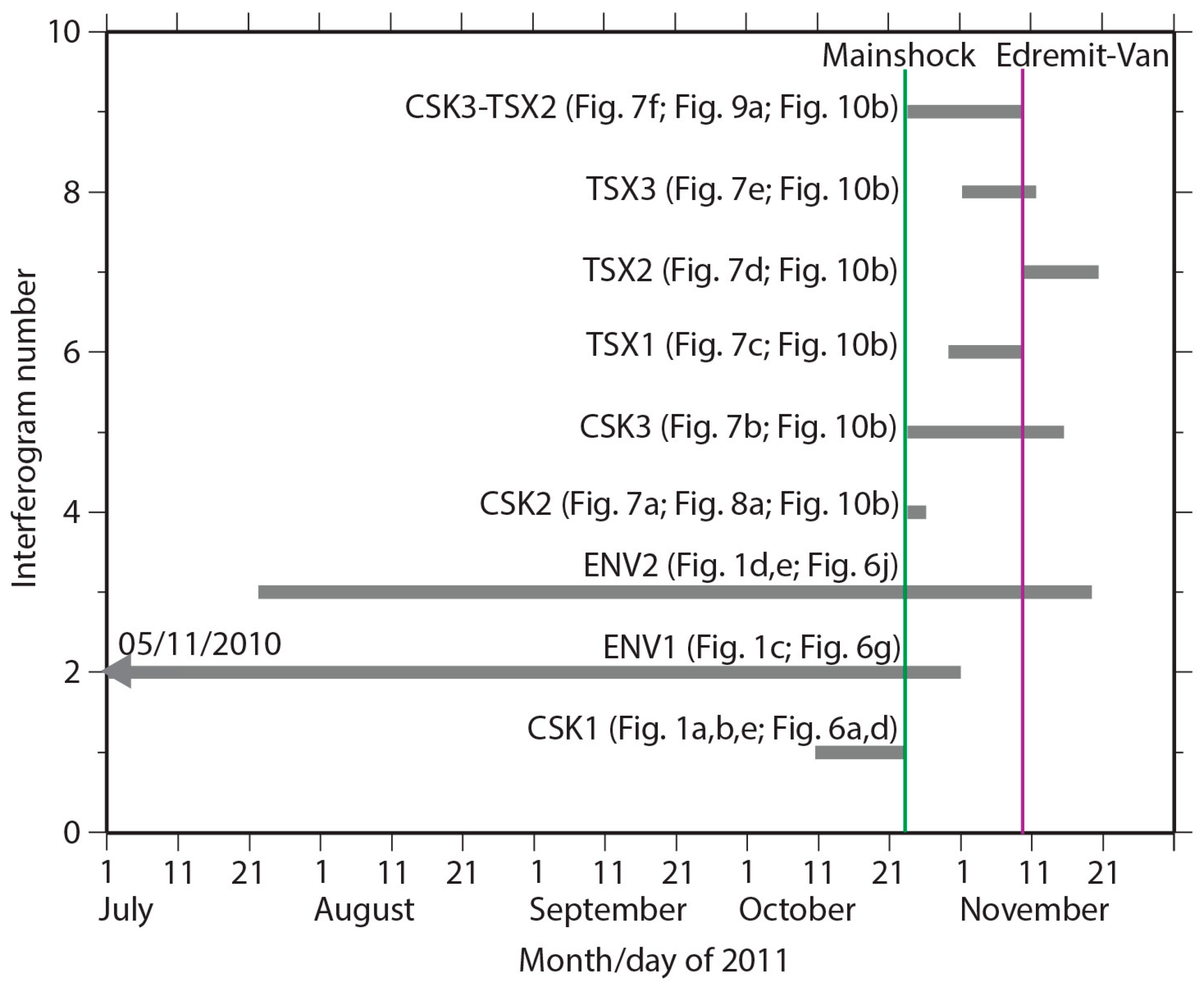 Graphical representation of the interferograms’ time span during the coseismic and post-seismic phases.