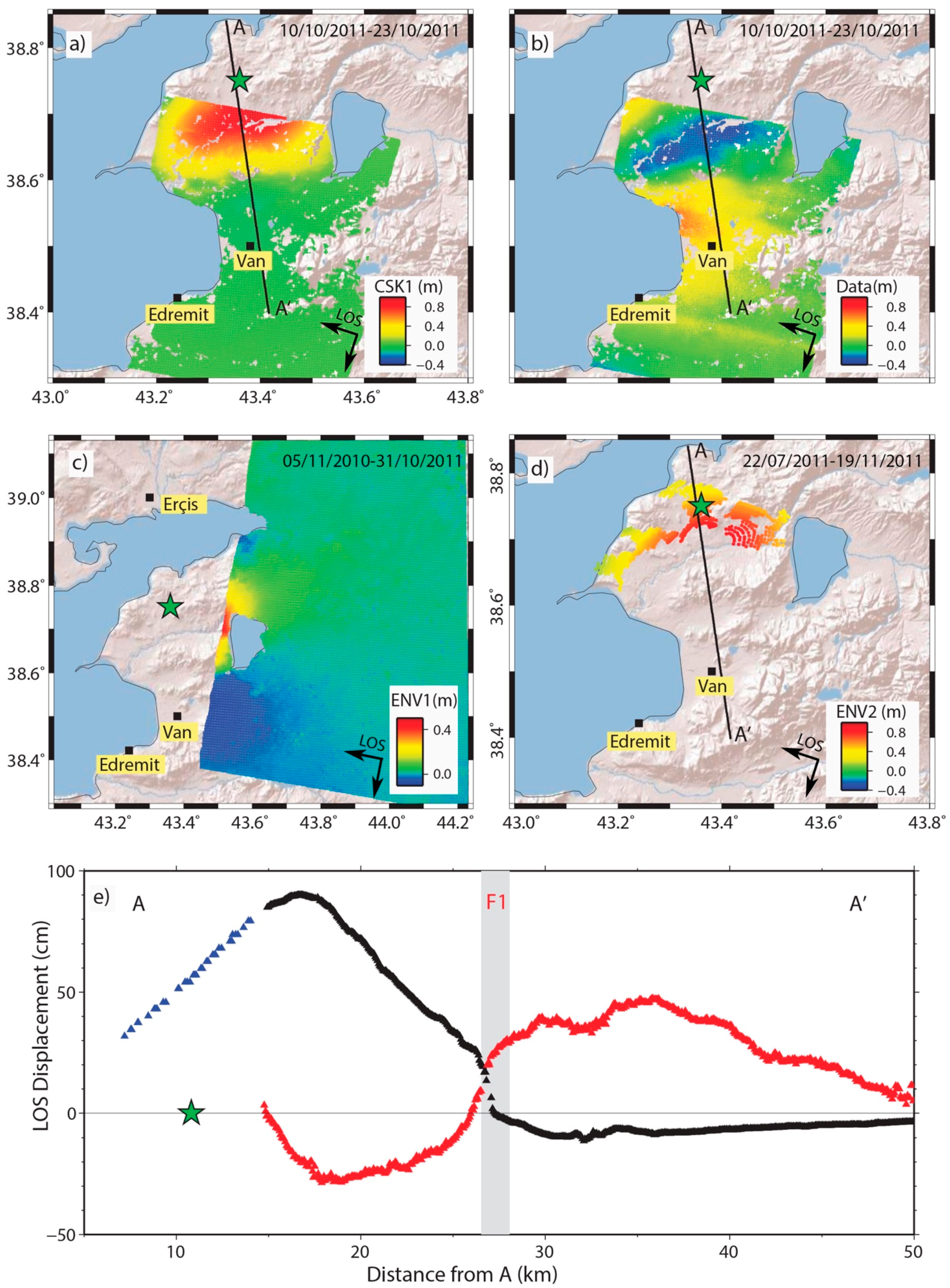 InSAR results: (a) CSK range results (i.e., LOS direction); CSK1; (b) CSK azimuth results (positive Northwards); (c) ENV1, LOS displacements; and (d) ENV2, LOS displacements. SAR data details can be found in Table 1; (e) Data along the profile AA’: CSK1 (range measurements, black), CSK (azimuth measurements, red), and ENV2 (LOS measurements, blue). The grey vertical band indicates the fault trace (F1) and its uncertainty (~1 km). The green star is the hypocenter.