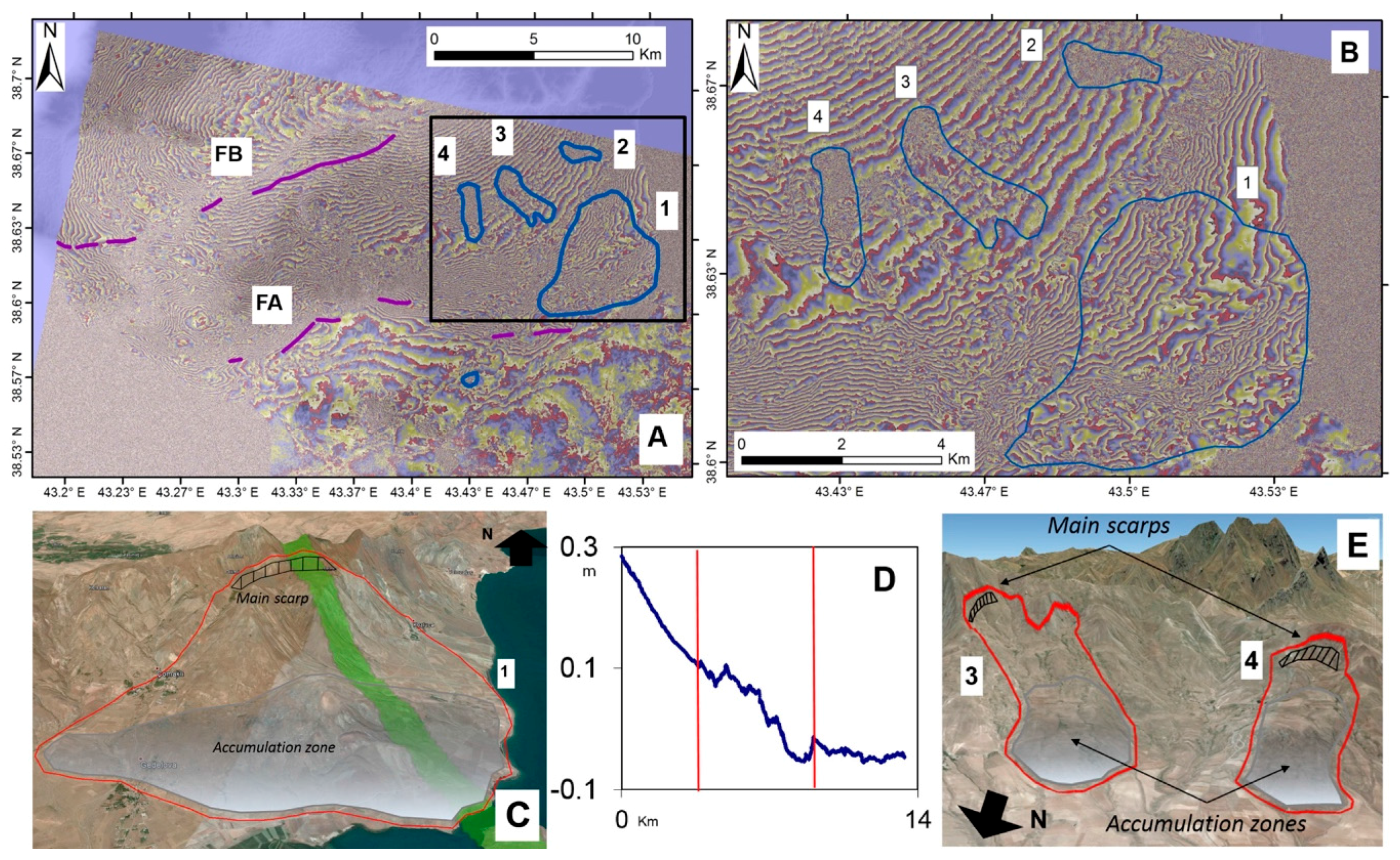 Additional anomalous fringe patterns and/or decorrelation areas can be found in Figure 4A. Some of these patterns could be due to surface phenomena related to the earthquake occurrence, like landslides. Indeed, the coseismic shaking could activate landslides characterized by a deep or shallow rupture surface (e.g., [27] and references therein). By analyzing the CSK wrapped interferogram, we identified a landslide type called Deep-seated Gravitational Slope Deformation (DGSD), located about 43.5123°E, 38.6244°N (landslide 1 in Figure 4A–C). This type of phenomena is normally characterized by variable deformation rates from less than 1 mm to few centimeters per year, and they could be triggered by seismic events or heavy rainfall. Moreover, DGSDs are often revealed with geomorphological evidences, such as double crest ridges, counterscarps or gravitational half-grabens. Some of these features, such as crest ridges and counterscarps, were also recognized for the landslide 1 of this work. In the CSK interferogram, the area involved by the DGSD shows a different fringe pattern. In particular, the spacing between the fringes into the landslide body appears to be larger (and chaotic) with respect to the area nearby the landslide, where the fringe spacing is regular and follows the pattern due to the coseismic displacement (Figure 4B). This is also observable in the along-slope displacement profile (green stripe in Figure 4C) from the CSK unwrapped phase, where we observe the regular coseismic displacement distorted by a well-localized displacement pattern related to the coseismic activation of the DGSD. Indeed, the signal corresponds to the landslide body that moves downstream as an independent mass, and it is characterized by a different dislocation of the upper part of the landslide body with respect to the accumulation zone. In addition, North of landslide 1 there are three small areas where a loss of coherence occurs (Figure 4A,B). The regular fringe pattern is sharply interrupted in correspondence of these areas: this phenomenon could be associated to sudden motion temporally occurred between two SAR acquisitions. By comparing the InSAR fringes with optical imagery, we identify three landslides (labeled 2, 3 and 4 in Figure 4A,B,E) located near the epicenter area, suggesting the occurrence of additional coseismic displacement due to the seismic shaking.