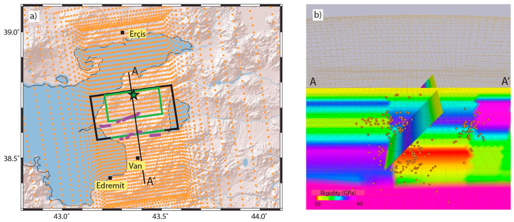 FE model of the Van Earthquake: (a) Top view of the model. The uniform slip fault is reported by green line while the fault plane used to retrieve the slip distribution is indicated by the black line. Surface ruptures constrained by InSAR are indicated by purple lines. The green star is the hypocenter and the orange dots are the surface nodes of the FE model; (b) Rigidity distribution on the section AA’ (see Figure 3) and on the fault plane within the heterogeneous FE model, view from West. The external edges of the FE model are shown with ochre lines. The seismicity within few kilometers from the section is reported by ochre spheres.