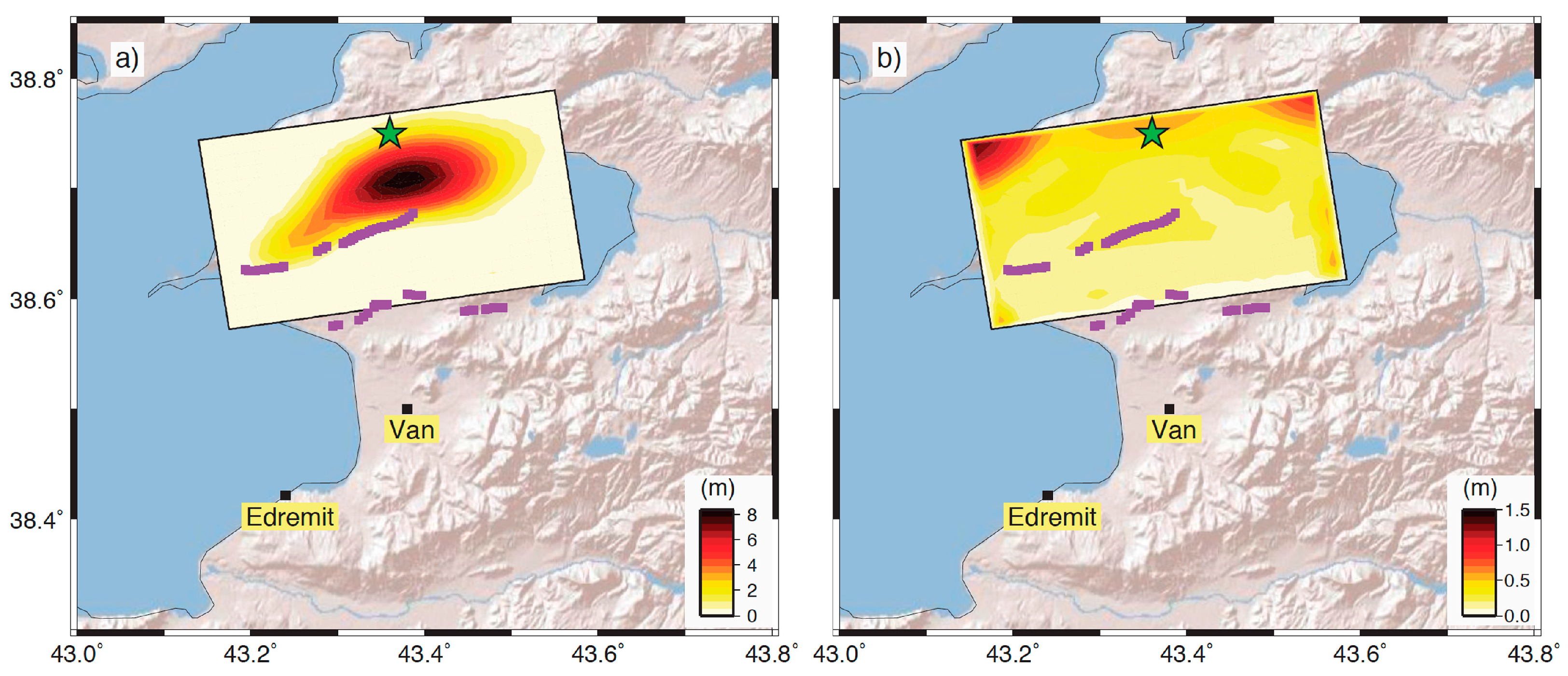 Fault slip distribution retrieved from geodetic data: (a) fault slip distribution; and (b) error associated. The surface fractures are reported by purple lines, and the Van earthquake epicenter by the green star.