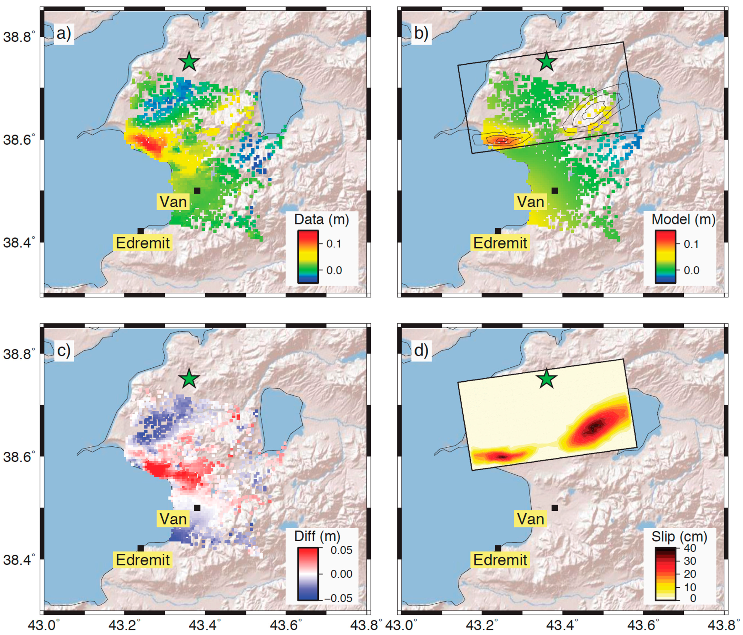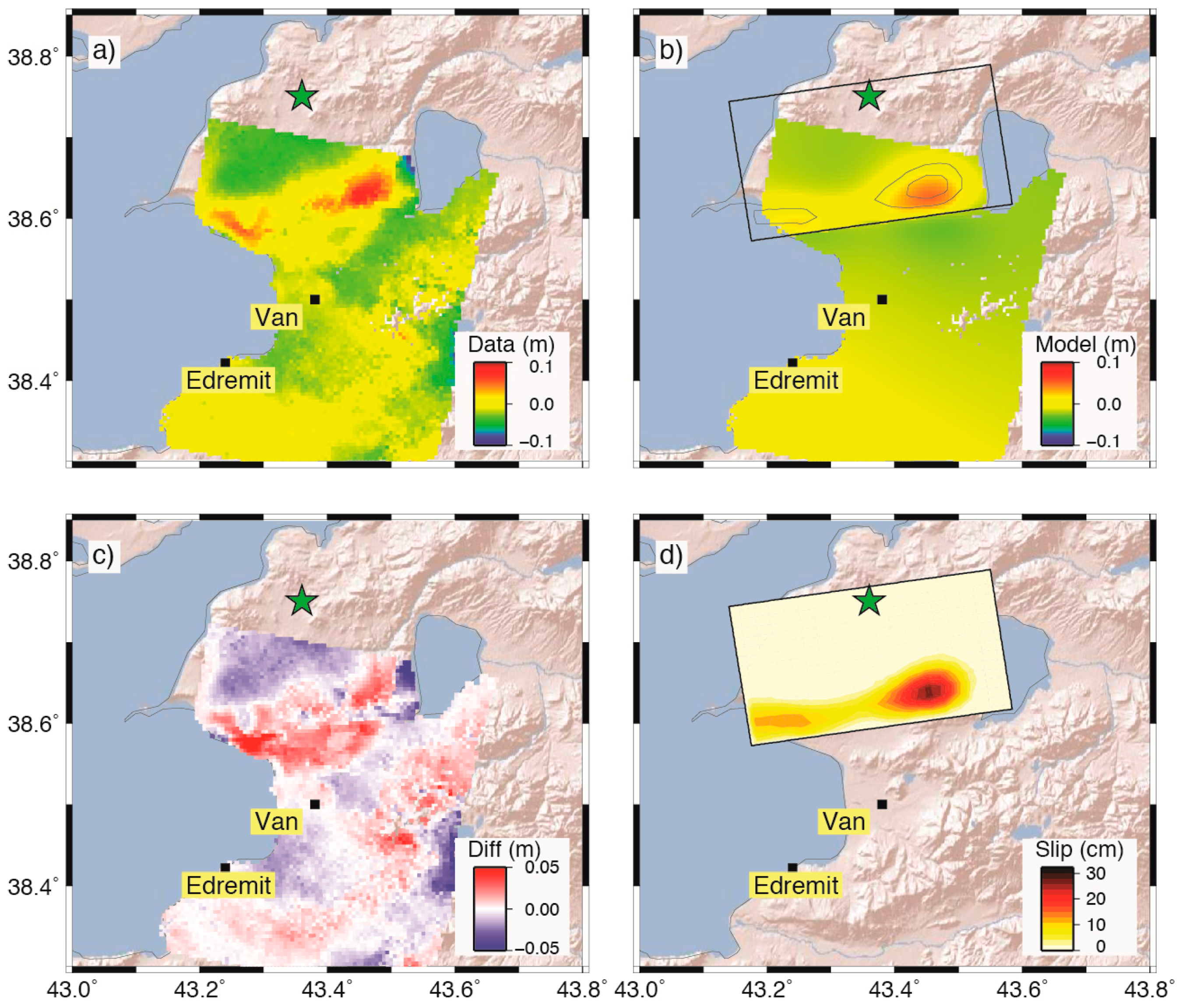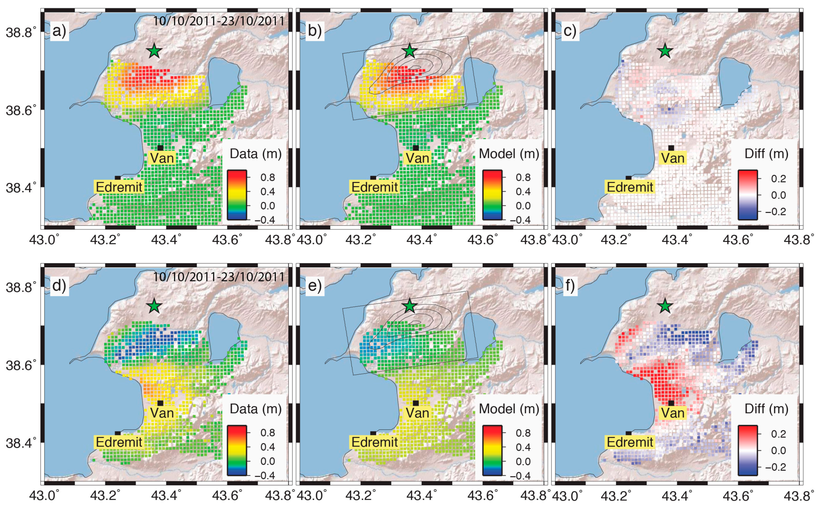 - Fielding, E.J.; Lundgren, P.R.; Taymaz, T.; Yolsal-Cevikbilen, S.; Owen, S.E. Fault-slip source models for the 2011 m 7.1 van earthquake in Turkey from sar interferometry, pixel offset tracking, gps, and seismic waveform analysis. Seismol. Res. Lett. 2013, 84, 579–593. [Google Scholar] [CrossRef]