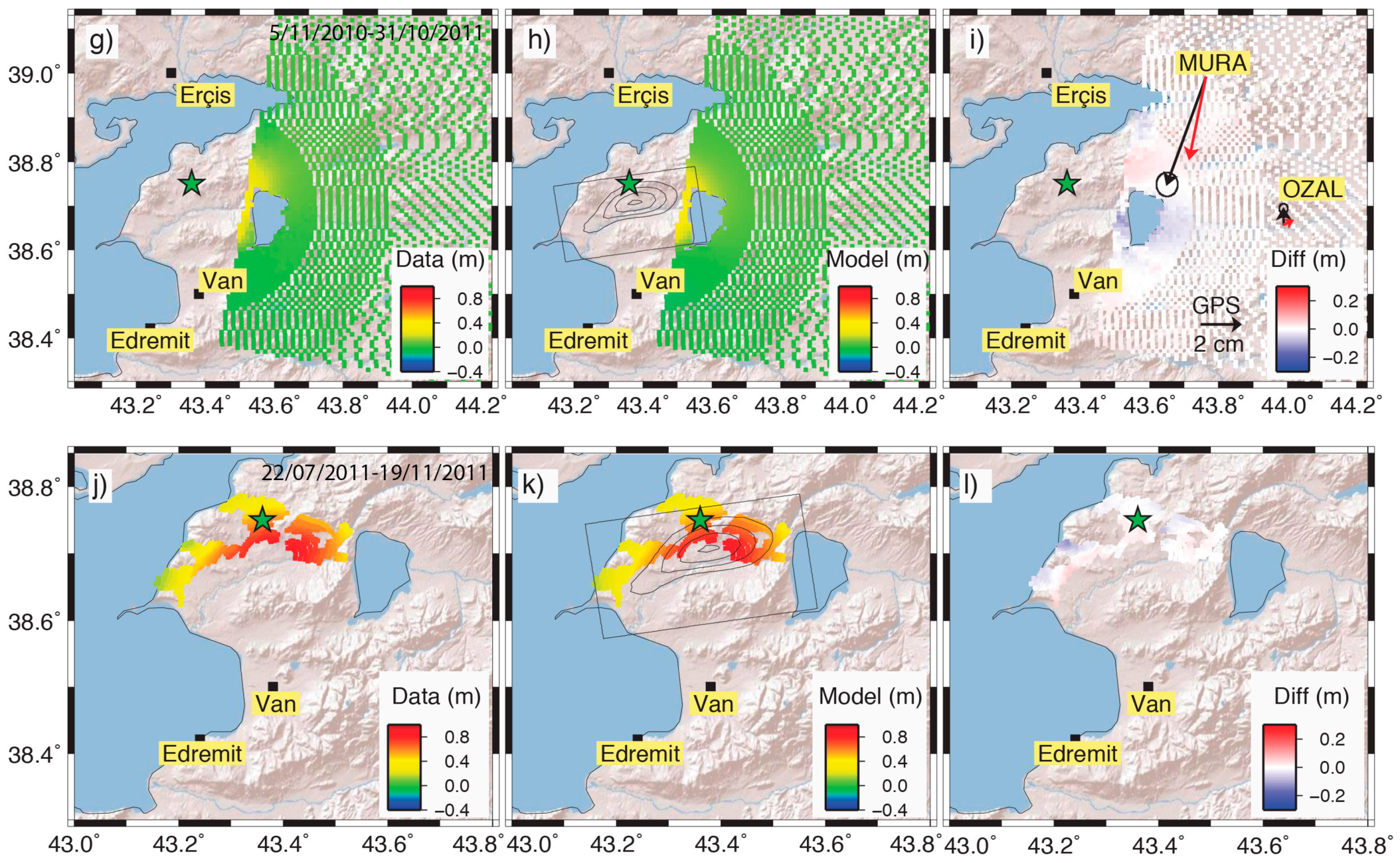 Comparisons between observed data (first column) and predictions (second column) related to the coseismic displacements of the Van earthquake. The residuals are observed minus modeled data (third column): (a–c) CSK1 (1210 data points); (d–f) CSK azimuth data (891 points); (g–i) ENV1 (2317 data points), near field GPS displacement vectors are also reported (black, observed; red, computed); and (j–l) ENV2 (896 data points). The green star is the hypocenter while the fault embedded in the FE model is indicated in black, with slip contour each 2 m.