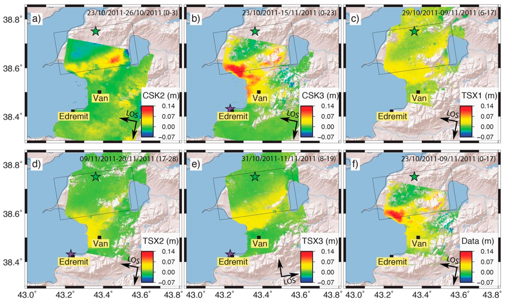 In order to obtain a better representation of the temporal evolution of the Van earthquake post-seismic deformation, we attempted to remove the geodetic signal of the Edremit-Van earthquake by subtracting the TSX2 displacements from the CSK3 displacements. The CSK3 image spans from the mainshock to 15 November 2011, while the TSX2 master image was acquired few hours before the Edremit-Van earthquake and the slave image is dated 20 November 2011. In this process we assumed that the CSK and TSX satellites had the same LOS (there are few degrees of difference in the looking angles) and that the five-day difference between the two slave images carried negligible post-seismic displacement. In this way, we obtained a map of 17-day displacements from the mainshock to the Edremit-Van earthquake, excluding the latter. The result, shown in Figure 8f, has an oblique belt of positive displacements near the fault trace, similarly to the three-day post-seismic interferogram CSK2, to TSX1 and to the original CSK3 (Figure 8a–c). High positive displacements are located close to the Lake Van shoreline, near the town of Bardakçi, for a maximum amount of 14 cm. The area corresponds to the place of surface ruptures as documented by [7], and confirmed by this work.