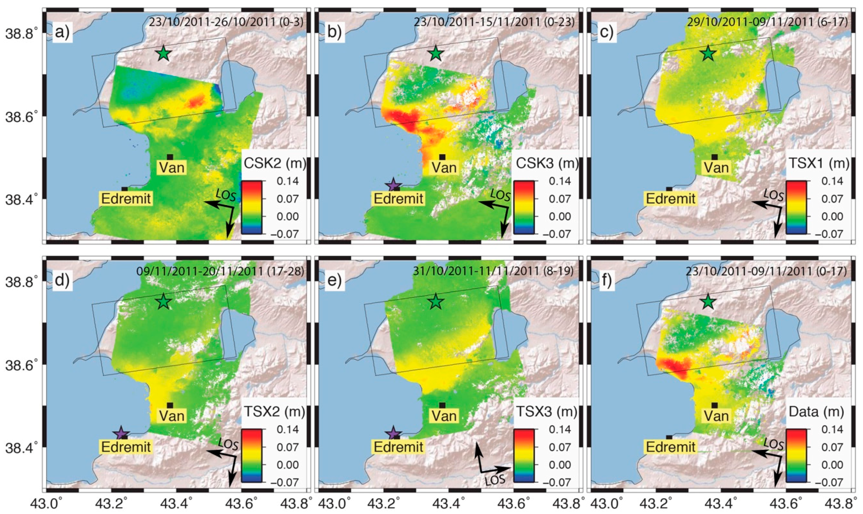 From the exploitation of the TSX dataset, we obtained two descending orbit interferograms spanning from few days after the Van earthquake to few hours before the Edremit-Van earthquake (TSX1, Figure 8c) and from before the Edremit-Van earthquake to 20 November 2011 (TSX2, Figure 8d). We use the same multilook factor as CSK, 11, in range and azimuth. TSX1 shows a pattern similar to CSK2 and CSK3, with highest LOS displacements close to the shore of Lake Van, North of Van. The signal in TSX2 between Van and the shore may be associated to the displacement due to the Edremit-Van earthquake. Only one pair of ascending TSX images provided good results in terms of coherence (TSX3, Figure 8e). The map shows displacements strongly affected by both the post-seismic deformation of the Van earthquake and the deformations due to the Edremit-Van earthquake. As a final remark, we exclude that the observed signals are due to atmospheric artifacts since the post-seismic deformation is found in all the interferograms in Figure 8.