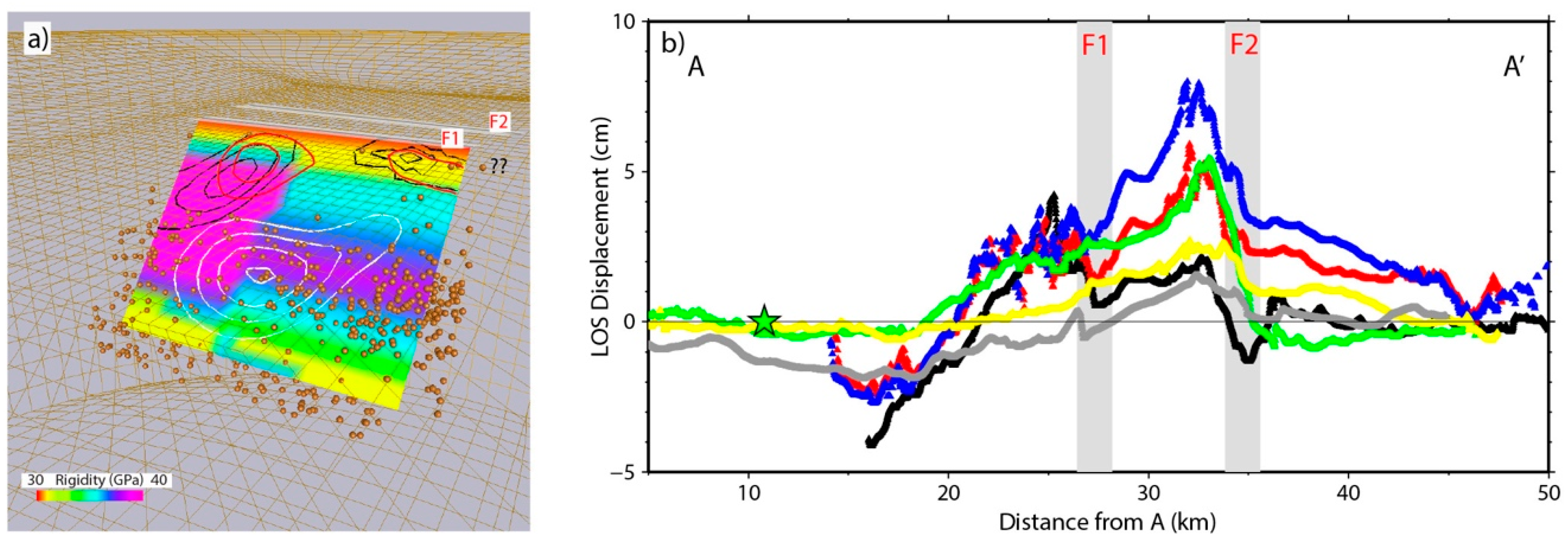 Coseismic and post-seismic results: (a) 3D view of the Van earthquake fault from the NW. Coseismic slip (white lines, contour every 2 m) and the post-seismic slip (red and black lines are three and 17 days after the mainshock, respectively, contour every 10 cm) superimposed on the rigidity heterogeneities of the fault plane within the FE model. Aftershocks hypocenters within 4 km from the fault are shown by ochre spheres; (b) AA’ profile (see Figure 5a) across the traces of the main fault (F1) and the splay fault (F2). The colors are: CSK2, black; CSK3, blue; TSX1, grey; TSX2, yellow; TSX3, green; and the difference between CSK3 and TSX2, red. The green star is the Van earthquake epicenter.