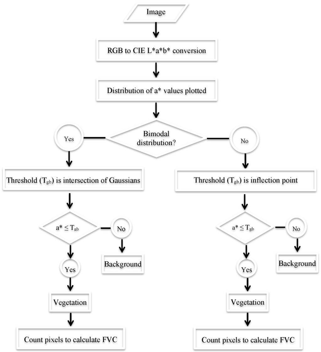 A threshold, Tgb, for segmentation is determined automatically by detecting the lowest point of intersection between the peaks of the distribution (see Figure 2). An image is segmented by marking the pixels with a* color values less than or equal to Tgb as belonging to the canopy and all other pixels as background. Fractional vegetation cover is estimated as the ratio of the number pixels in the canopy to the total number of pixels in the photograph.
