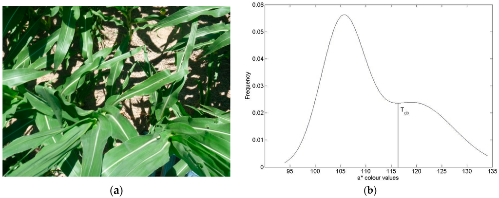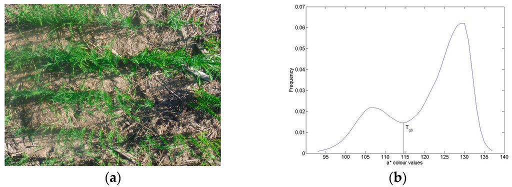 An image of flax (a) and the smoothed probability distribution of its a* color values (b). Tgb is the threshold for segmentation in the ACE algorithm.