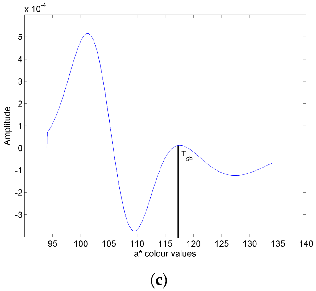 where x is a vector of a* color values, are the means and covariances of each Gaussian, respectively. The contribution of the ith Gaussian is determined by the weight wi. For the bimodal distribution, N is set to 2. The GMM is estimated using the non-linear iterative Nelder–Mead simplex optimization algorithm [36]. The Nelder–Mead algorithm is a direct search algorithm that does not use derivatives, so it can be used for discontinuous functions. The algorithm takes an initial solution set and forms a simplex. The function is evaluated at each point of the simplex and minimized by shifting (reflecting, shrinking or expanding) the vertices of the simplex. The algorithm iteratively seeks an improved estimate, based on a specified tolerance.