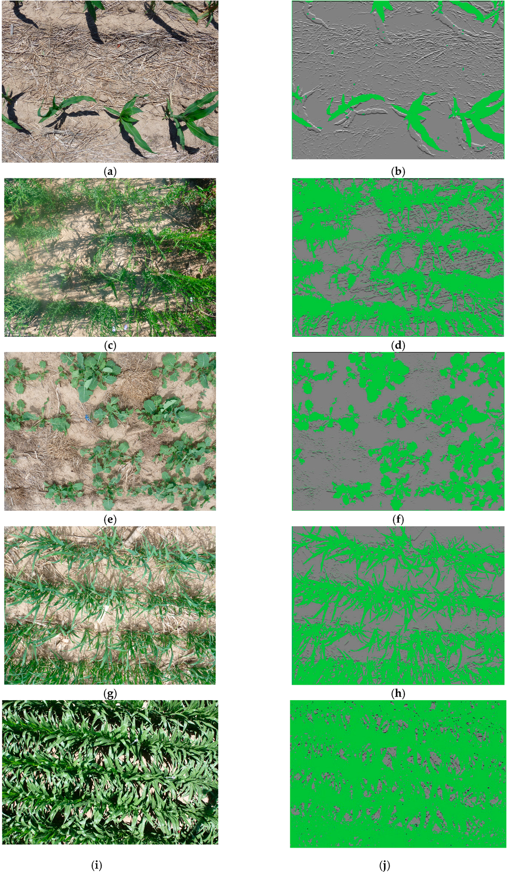 (a–j) Image segmentation using ACE. Photographs taken with a handheld digital camera along with the respective segmentations performed by ACE. Corn (a,b); flax (c,d); rapeseed (e,f) and oat (g,h). Remotely sensed corn, taken from a platform 7 m above the soil surface (i); and its ACE segmentation (j).