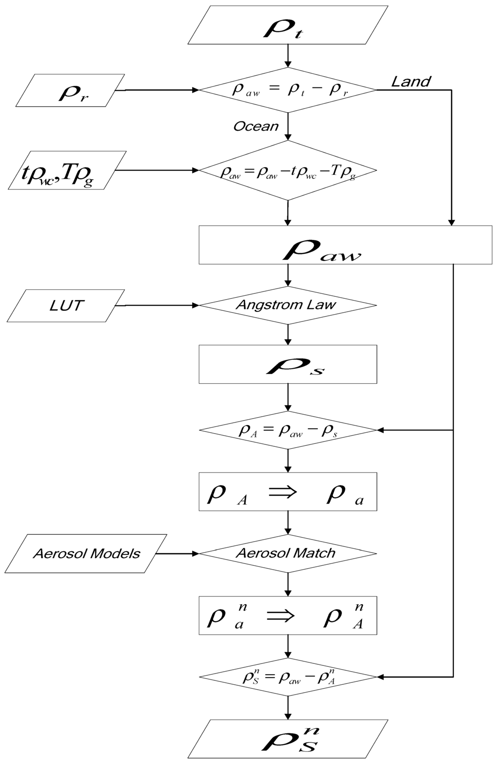 The Rayleigh scattering reflectance, , needs to be accurately computed to obtain the ground-aerosol reflectance, , for both land and ocean. For the ocean, the reflectance of the ocean whitecaps and Sun glitter off the sea surface are also computed along with their transmittance. The LUT is used to obtain the in situ ground reflectance, , based on Angström’s law. The component, , is used to compute the aerosol scattering reflectance, including the Rayleigh- aerosol interactions, , which is transformed to obtain the aerosol scattering reflectance, . The aerosol models are used to match the two closest models, which are then used to compute the estimated aerosol reflectance, . The aerosol reflectance, including the Rayleigh-aerosol interactions, , is transformed from and then used to obtain the ground reflectance, .