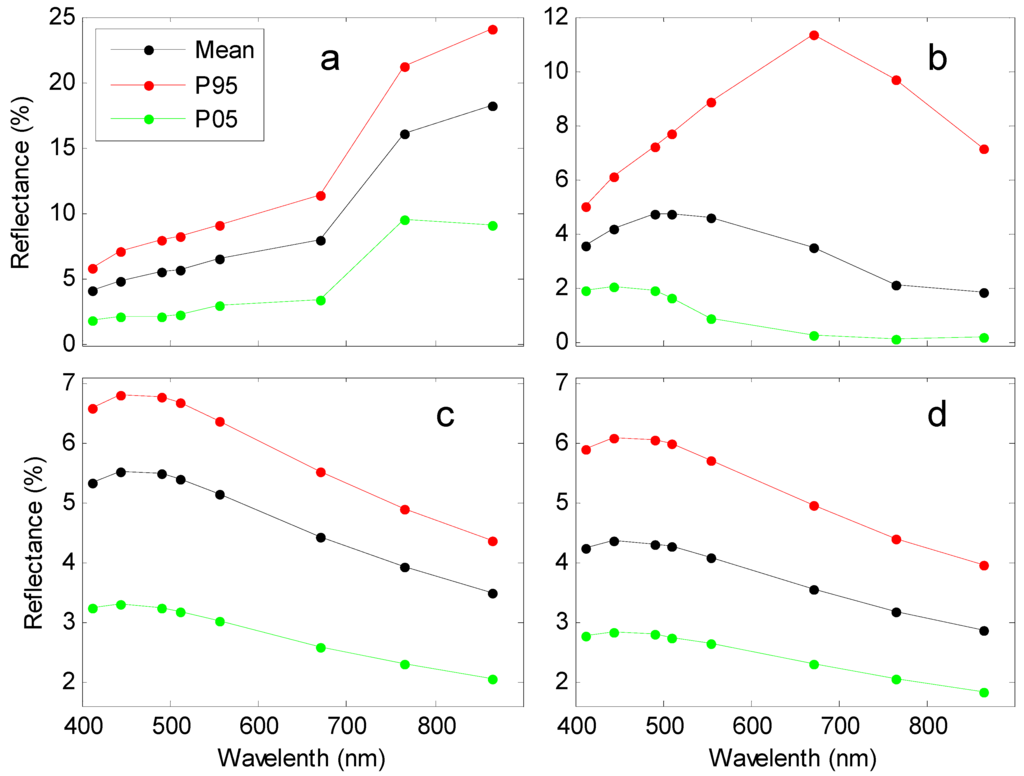 The land reflectance increases with increasing wavelengths, the mean spectrum going from 4.09% at 412 nm to 18.23% at 865 nm (Figure 4a). The spatial variations of the reflectance in Band 1 (1.87%–5.85%) are relatively small, while those in Band 8 (9.16%–24.05%) are quite large. The shapes of the three land spectra are similar, demonstrating that the averaging effect on the 1-km2 scale of a pixel significantly reduces the variability in the spectra of the ground reflectance. However, the wavelength dependence in the ocean reflectance is quite different, indicating that there is significant spatial variability in the reflectance between different water types (Figure 4b). In particular, the wavelength of the maximum reflectance shifts toward shorter wavelengths, and the magnitudes become smaller as the location changes from very turbid waters to clear oceanic waters. The variation of the reflectance in Band 6 is the largest, with a range of 0.31%–11.37%. The P05 spectra are more typical of the reflectance of clear oceanic waters with negligible values in Band 8, while the P95 spectra represent spectra from turbid waters with quite large values in the near-infrared band. Although the aerosol reflectance decreases with increasing wavelength, their shapes differ in the shorter bands due to the effects of multiple scattering (Figure 4c,d). In addition, the aerosol values are close to or higher than those of the land reflectance at visible bands (Figure 4a,c), indicating that the atmospheric correction of the satellite reflectance over land is necessary.