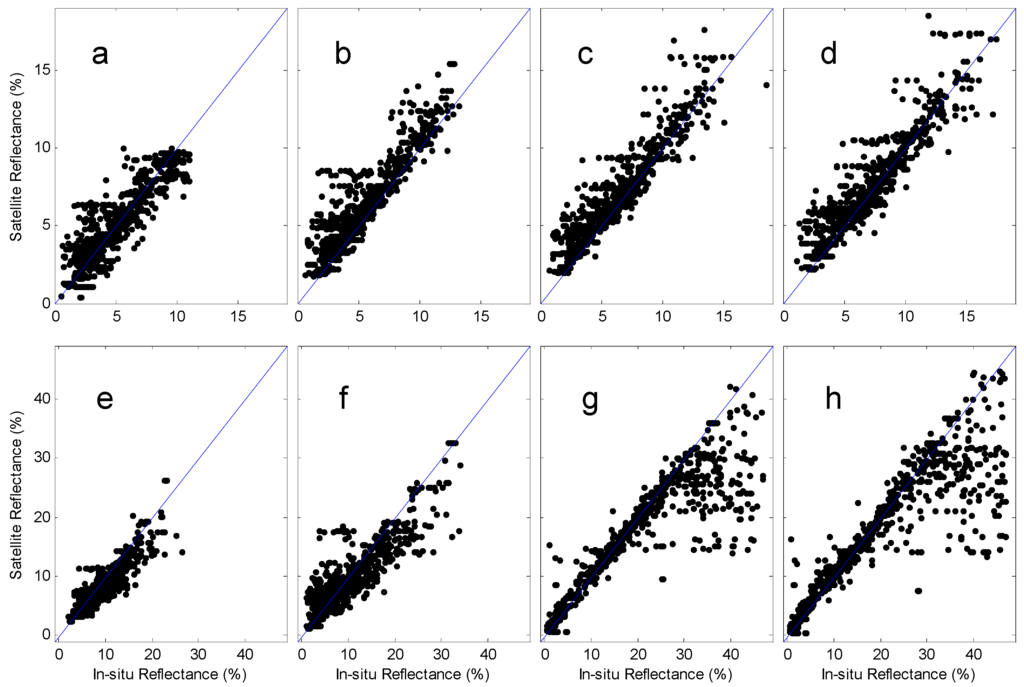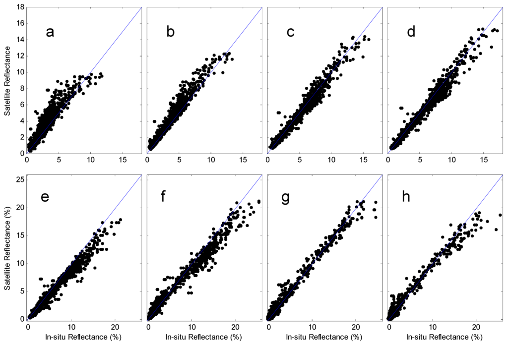 The comparisons of the land reflectance between the satellite-derived and in situ measurements for SeaWiFS Bands 1–8 are shown in (a–h), respectively.