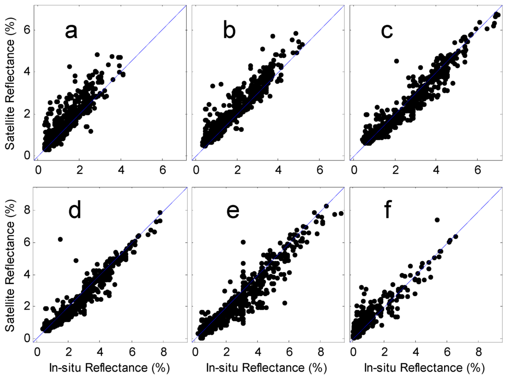 Because the in situ reflectance in the near-infrared bands over water is unreliable using the in-water method, only six bands are used to evaluate the accuracy. It is clear in Figure 8 that, as with the previous results, most points are tightly clustered around the 1:1 line. However, there are a few pairs that have large differences. There are several factors that can introduce uncertainty in the in situ reflectance when using the in-water method. These uncertainties can be introduced by the in situ measurement during the instrument operations and by the in situ data processing used to deduce the water-leaving reflectance. Frequently, the difference in the reflectance between two measurements from the same station exceeds 10%.