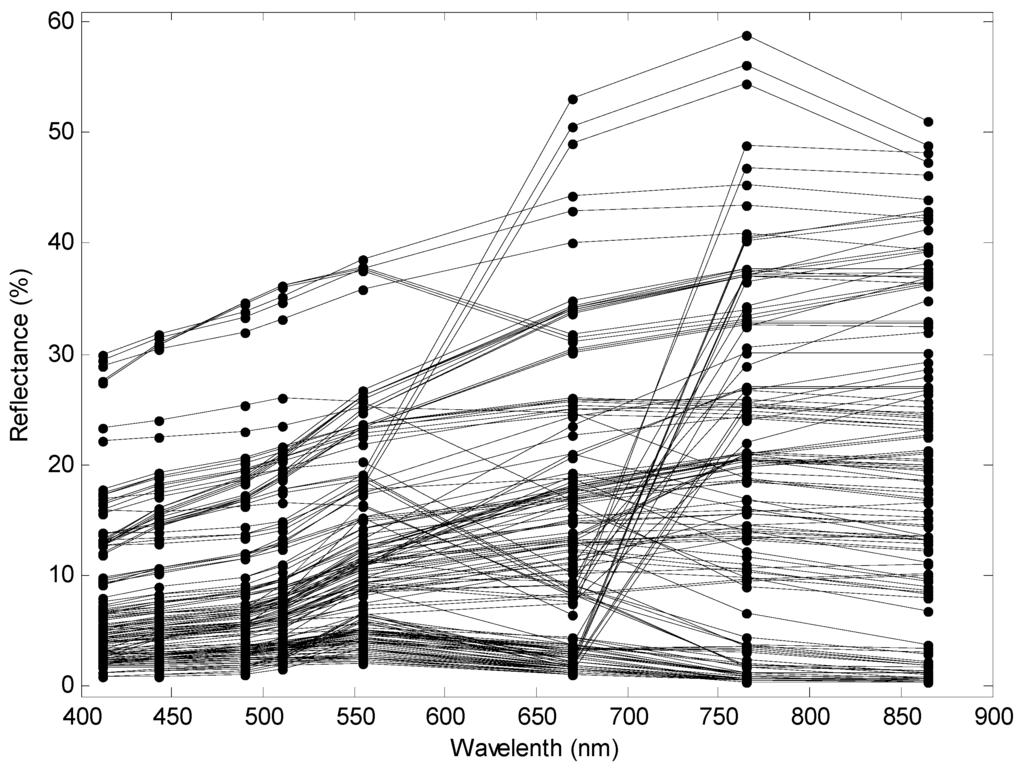 There are some line-shape points distributed in Figure 6, indicating that one satellite value is corresponding to some different objects of the in situ measurements. Figure 9 shows an example that there are 139 spectra of different objects measured within the area of one pixel in Qingdao (the location is marked in Figure 5). It is clear that the reflectance varies significantly from object to object and over the SeaWiFS wavelength bands, from a low of 0.35%–51.16% in Band 8. The mean reflectance of these objects is still not suitable to represent the actual mean reflectance of the satellite pixel because it is likely that there are other objects that are still not measured in this area of the same pixel. Therefore, it is difficult to determine which set of objects reflectances is suitable for validating the satellite observation.