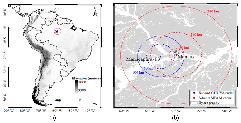 Study area: (a) location and (b) radius of the S-band SIPAM (red) and X-band CHUVA (blue) radars located near the cities of Manaus and Manacapuru. Solid lines represent the radar original coverage. The dashed lines correspond to the areas investigated in the present study.