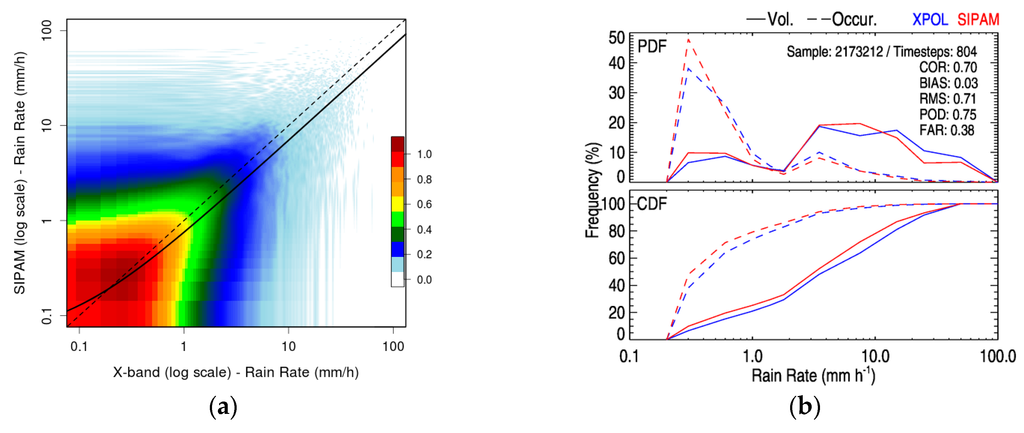 Comparative analysis between S-band SIPAM and X-band CHUVA radars: (a) density scatterplot; and (b) probability and cumulative density functions of rainfall volume and occurrences. Note that the x-axis is in the log-scale.