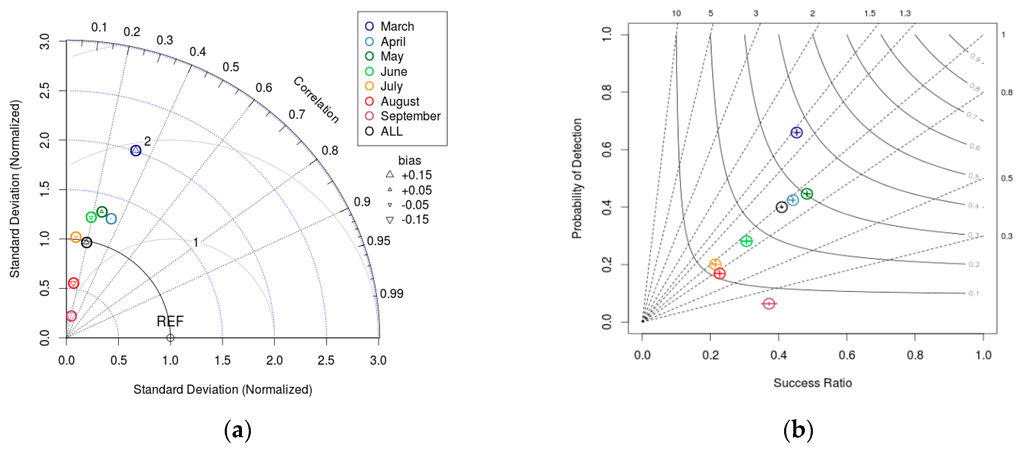 Continuous and categorical analyses can be graphically consolidated into the Taylor [58] and performance [59] diagrams. The Taylor diagram provides a way to summarize how closely a set of patterns matches observations, using COR, RMSE and SD. In Taylor diagrams, the SD increases with the radial distance from the origin and is normalized by the reference datasets, where 1.0 is the best reference value. In this performance analysis, bias values are also included in the Taylor diagram. The performance diagram utilizes the geometric relationship between SR, POD, BIAS and the CSI to display all four metrics simultaneously, with a perfect forecast lying in the upper right region of the diagram.