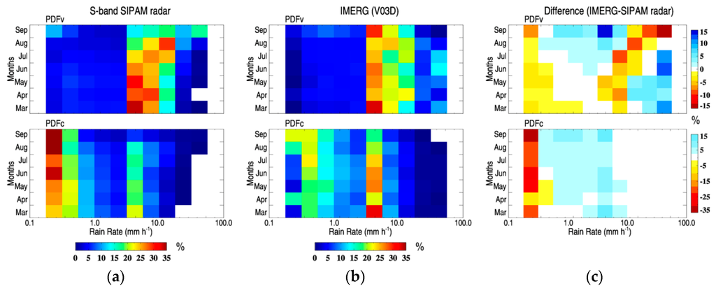 Monthly probability density functions of (a) S-band SIPAM radar; (b) IMERG (V03D) and (c) their differences (IMERG-SIPAM) over the Manaus region from March–September 2014 (wet to dry). Upper and lower panels indicate the PDFv and the PDFc distributions, respectively.