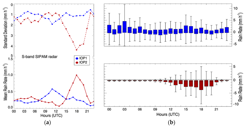 In the dry period, the S-band SIPAM radar presents peaks of rain rate mean and SD between 15:00 and 21:00 UTC, with values around 1 and 4.5 mm·h−1, respectively. Secondary rainfall mean (~0.4 mm·h−1) and SD (~1.8 mm·h−1) peaks are found in the first hours of the day (from 00:00–08:00 UTC). The dry period is also characterized by higher SD than the wet period, which suggests a larger spatial variability of rainy events. During the dry period, local characteristics are more evident, and preferential occurrence locations of convective rain cells are driven by local surface types and thermodynamic conditions [32], which explain the reason for the high mean and SD differences between IOP2 and IOP1.