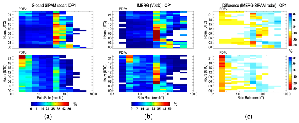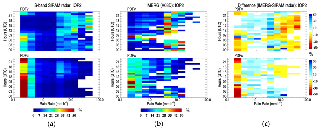 In order to study the satellite precipitation error distributions, we looked at volumetric (PDFv) and occurrence (PDFc) probability density function analyses [15,16,17,18,53]. The PDFv represents the relative contribution of each rain rate bin to the total rainfall volume. Similarly, the PDFc provides the frequency occurrences of each rain rate bin to the total number of occurrences. PDFc normally tends to emphasize lighter rainfall rates, due its high frequency of occurrence. We consider the following precipitation classes: 0.2–0.4, 0.4–0.8, 0.8–1.2, 1.2–1.6, 1.6–2, 2–5, 5–10, 10–20, 20–30 and ≥30 (in mm·h−1). The analysis is performed monthly from March–September and hourly for both wet (IOP1) and dry (IOP2) seasons over the S-band SIPAM radar coverage.