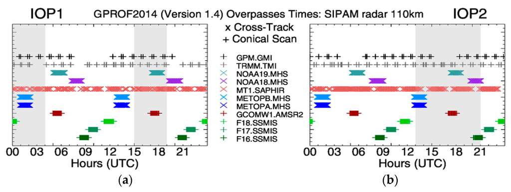GPM satellite/sensors constellation overpasses by GPROF 2014 (Version 1.4) over the Manaus region during the (a) GoAmazon/CHUVA IOP1 and (b) GoAmazon/CHUVA-ACRIDICON IOP2.