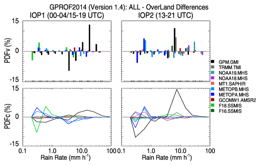 The physical characteristics of GPROF2014 PMW rainfall retrievals (e.g., sensor-based spatial resolution, representation of hydrometeors profiles, among others) may be indicated as the main cause of the algorithm limitations. In addition, the surface type factor (i.e., land, ocean, inland water, among others) and their different emissivity signals may also have significant contributions in adopting a particular hydrometeor profile and consequently in the final rainfall retrieval product. Figure 10 shows the GPROF2014 original-overland differences, which emphasize the portion of precipitation over the inland water (along the Negro, Solimões and Amazon rivers, near Manaus, Amazonia, Brazil). Figure 10 presents differences between each sensor and the S-band SIPAM radar during those times in which IMERG performs poorly. The most prominent GPROF2014 original-overland differences are found during the GPM GMI satellite sensor overpasses. GPROF2014 GMI presents large overestimation (underestimation) of rain rate volume and occurrence greater (less) than 10 mm·h−1 up to 15%, during IOP1. Large overestimations around 13% in PDFv and ~15% in PDFc of rain rates between 5 and 10 mm·h−1 are observed on IOP2. However, an underestimation of light rain rate occurrence frequency is observed by GPROF2014 for the GMI sensor. Evidence of the influence of the Amazon River and the topography in local circulations, cloud cover and, consequently, precipitation in the region, are well reported by observational data, such as radar and rain gauge and also by satellites, e.g., [28,29,32,33,62]. However, such differences in IMERG, for both the wet and dry periods, appear more prominent due to some systematic errors, which can emerge from a non-suitable adjustment linked to the continent-ocean surface type adoption by the GPROF2014 algorithm for GMI sensor.